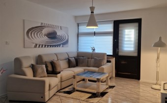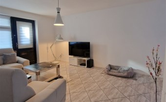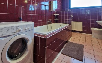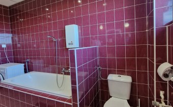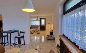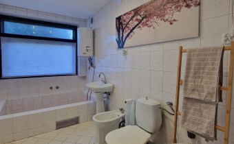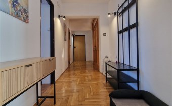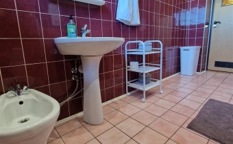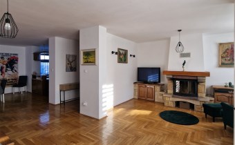 - 2 pokoi gościnnych, dużego salonu z kominkiem, oraz aneksem kuchennym i wyjściem na balkon, łazienki z wanną, bidetem i toaletą. Pomieszczenia łączy hall wewnętrzny z wejściem na klatkę schodową.