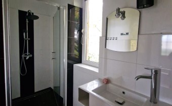 Piętro to trzy pokoje gościnne, łazienka z kabiną prysznicową i toaletą.