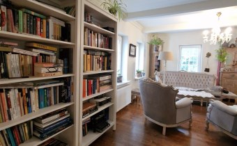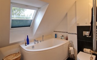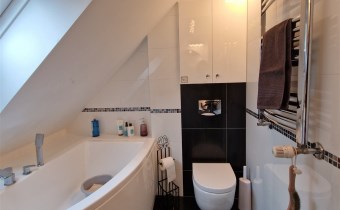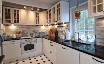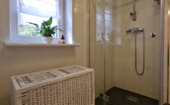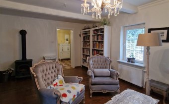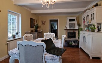Salon z kominkiem, osobna kuchnia, pokój gościnny z gabinetem, pomieszczenie gospodarcze, łazienka z kabiną i WC.