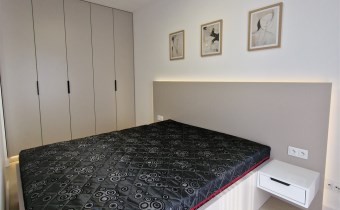 w sypialni łóżko z materacem, szafy w zabudowie, łazienka z WC - meble w zabudowie, nowoczesna kabina prysznicowa oraz pralko-suszarka.
